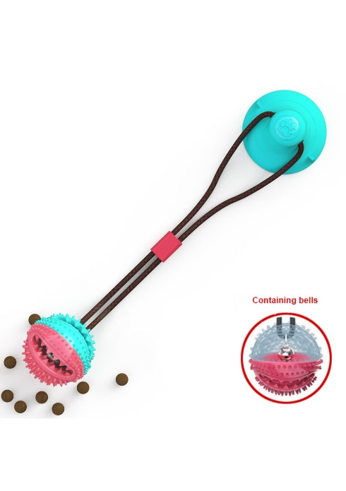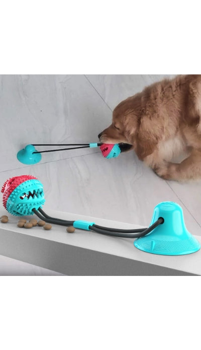 It typically consists of a durable ball attached to a strong drawstring, which is connected to a suction cup that can adhere to various surfaces. This setup allows dogs to tug, chew, and play independently, promoting physical activity and mental stimulation.